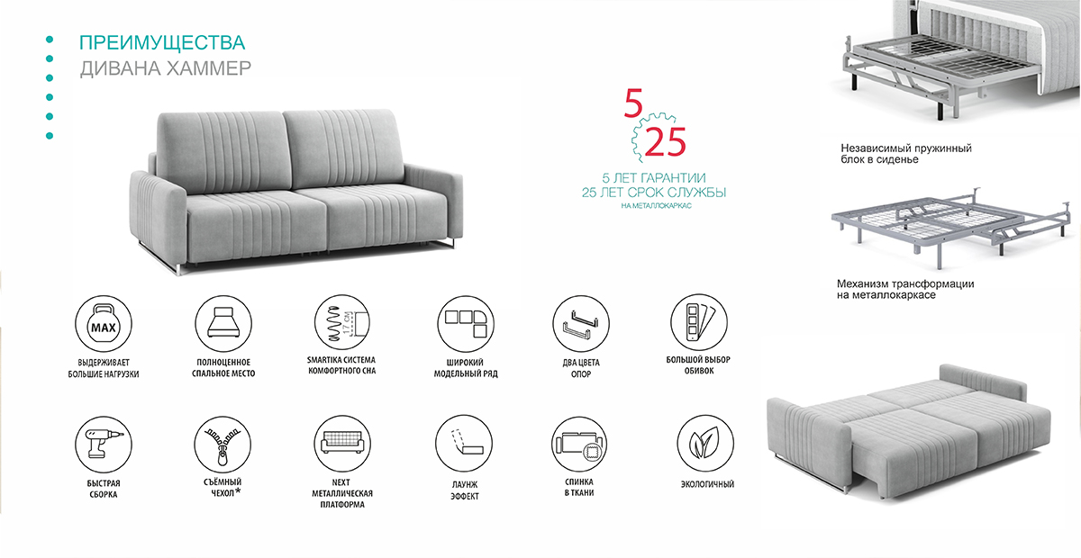 Как мощный двигатель обеспечивает автомобилю плавное и быстрое движение, так и продуманная конструкция дивана и маталлическая платформа NEXT гарантируют комфорт и долговечность. А мягкая посадка обеспечивается системой комфорта с блоком независимых пружин – Smartika.