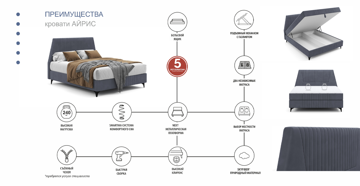 Кровать Айрис Люкс с матрасом впишется в любой современный интерьер и станет любимым местом в доме.