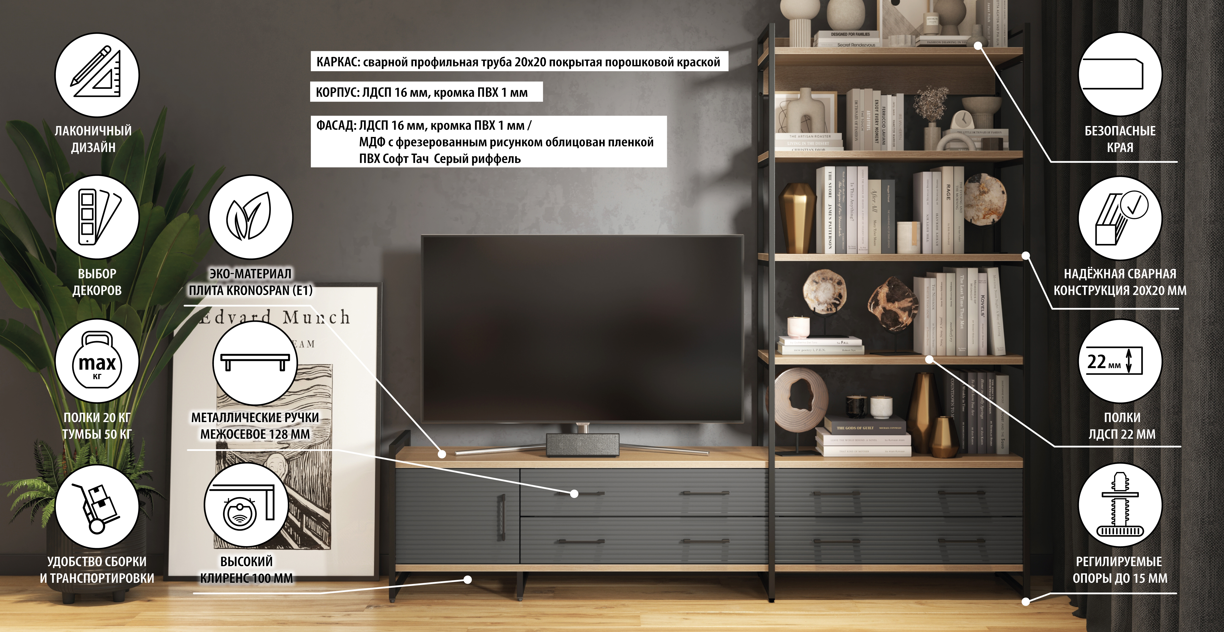 ТВ тумба Лукас выполнена в самом модном на сегодняшний день стиле лофт. Металлическая конструкция надёжна и 100% экологична. Благодаря своей прочности она способна выдерживать тяжелые нагрузки, воздействие влаги и грязи. Вся коллекция Лукас устойчива к перепадам температур. Регулируемые ножки ТВ-тумбы Лукас позволят сделать её максимально устойчивой и бережно отнесутся к вашему напольному покрытию. Направляющие полного выдвижения, плавные доводчики и приятные металлические ручки обеспечат комфортное пользование.
