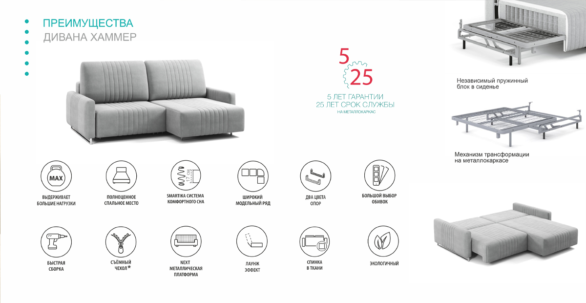 Как мощный двигатель обеспечивает автомобилю плавное и быстрое движение, так и продуманная конструкция дивана и маталлическая платформа NEXT гарантируют комфорт и долговечность. А мягкая посадка обеспечивается системой комфорта с блоком независимых пружин – Smartika.