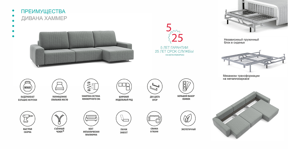 Модель Хаммер — как премиальный автомобиль в мире мебели. Представьте себе автомобиль, который сочетает в себе скорость, маневренность и комфорт. Так и модель модульного дивана Хаммер предлагает вам гибкость и адаптивность, позволяя выбрать конфигурацию, как будто вы настраиваете автомобиль под собственный стиль вождения.